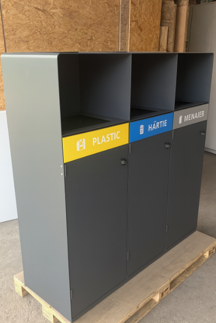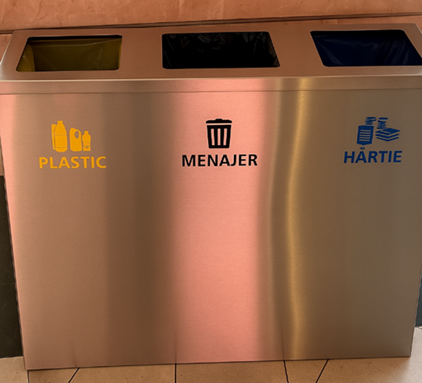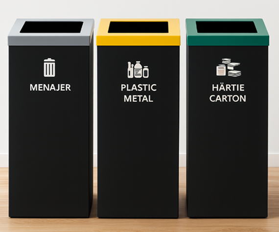 Disponibile în versiuni simple sau compartimentate (pentru colectare selectivă), coșurile sunt realizate din materiale rezistente la intemperii, dotate cu elemente antivandalism și pot fi ancorate în pardoseală sau amplasate liber. Etichetarea este vizibilă și standardizată, pentru a corespunde legislației în vigoare privind codurile deșeurilor.