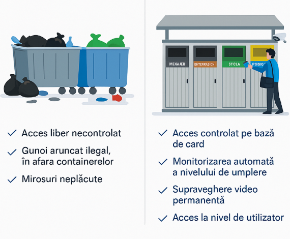 Soluția noastră de reciclare digitalizată modernizează fundamental modul în care comunitățile colectează și gestionează deșeurile. Prin integrarea tehnologiilor de acces controlat cu card, monitorizare automată și supraveghere video, oferim administrațiilor publice o modalitate eficientă, curată și transparentă de a administra punctele de reciclare. Utilizatorii pot accesa containerele rapid și sigur, datele sunt centralizate, iar impactul asupra mediului și asupra aspectului urban este semnificativ îmbunătățit. Rezultatul: mai puțină poluare vizuală, mai multă responsabilitate comunitară și o imagine modernă a orașului sau comunei.